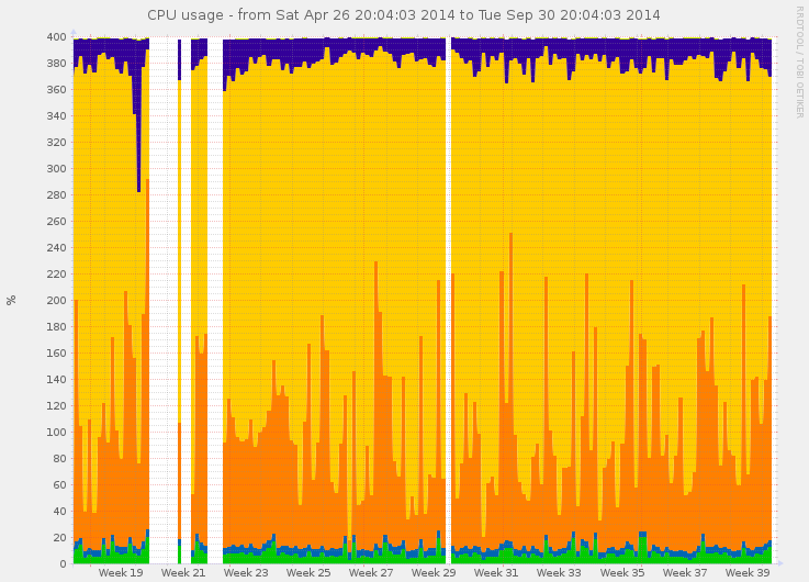 You can clearly see the huge drop in temperature at the end of Week 25 despite the continuously high CPU load. Also there is only a single gap in the data after the changes (these indicate crashes where data was not recorded) where before there were frequent and extensive times where the systems were simply unusable.