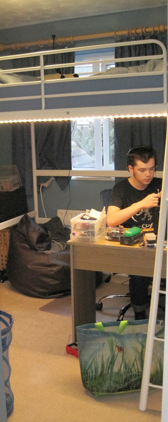 Joshua in his completed roomThe holidays this year afforded me some time to finish the boys bedrooms. They both got loft beds with a substantial area underneath. This allows them both to have double beds along with a desk and plenty of storage. Completing the rooms required the construction of some flat pack furniture which rather than simply do myself I supervised the boys doing it themselves.