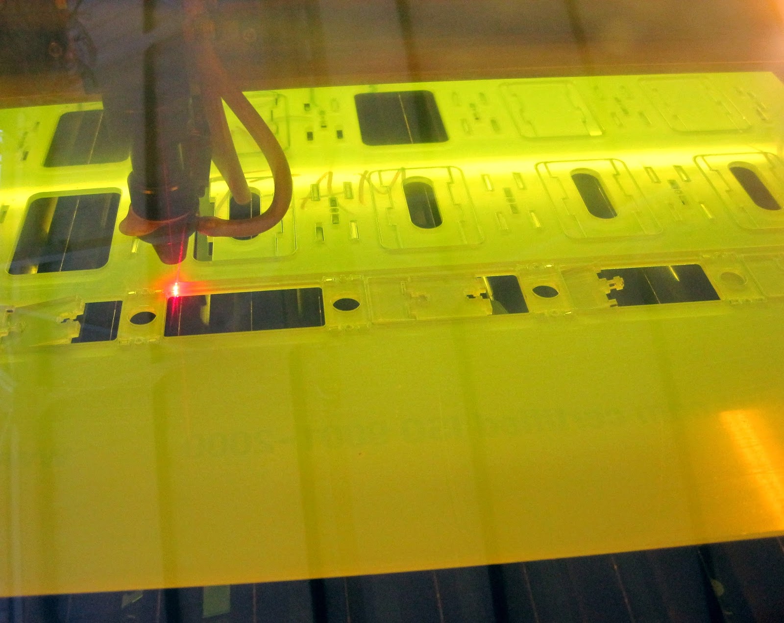 View of the acrylic being laser cut through the heavily tinted window