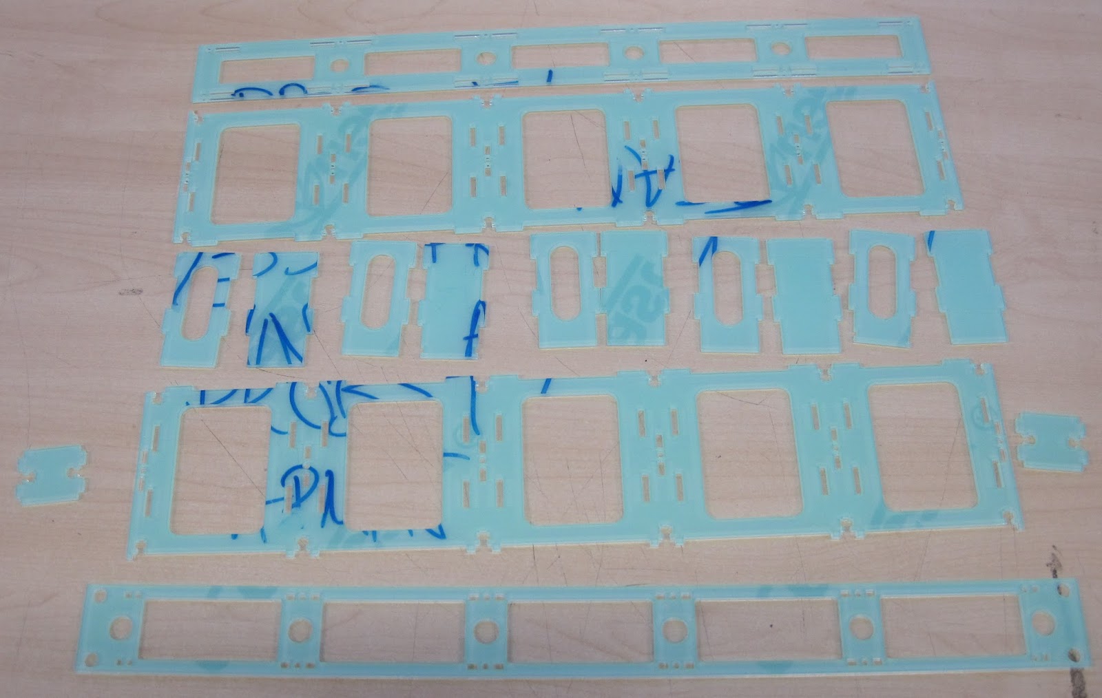 laser cut pieces arranged for assembly still with protective film on